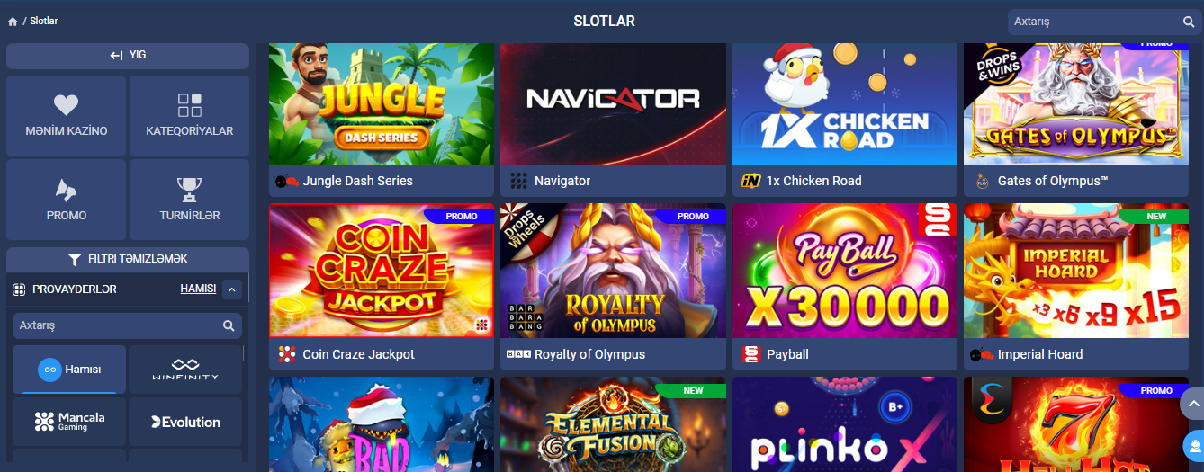 Minlərlə slot oyunu: Kazinonun oyun kataloqu Azərbaycanda ən böyüklərdən biri olmağa iddialıdır. Burada ən müxtəlif provayderlərdən 10,000+ slot seçimi mövcuddur.